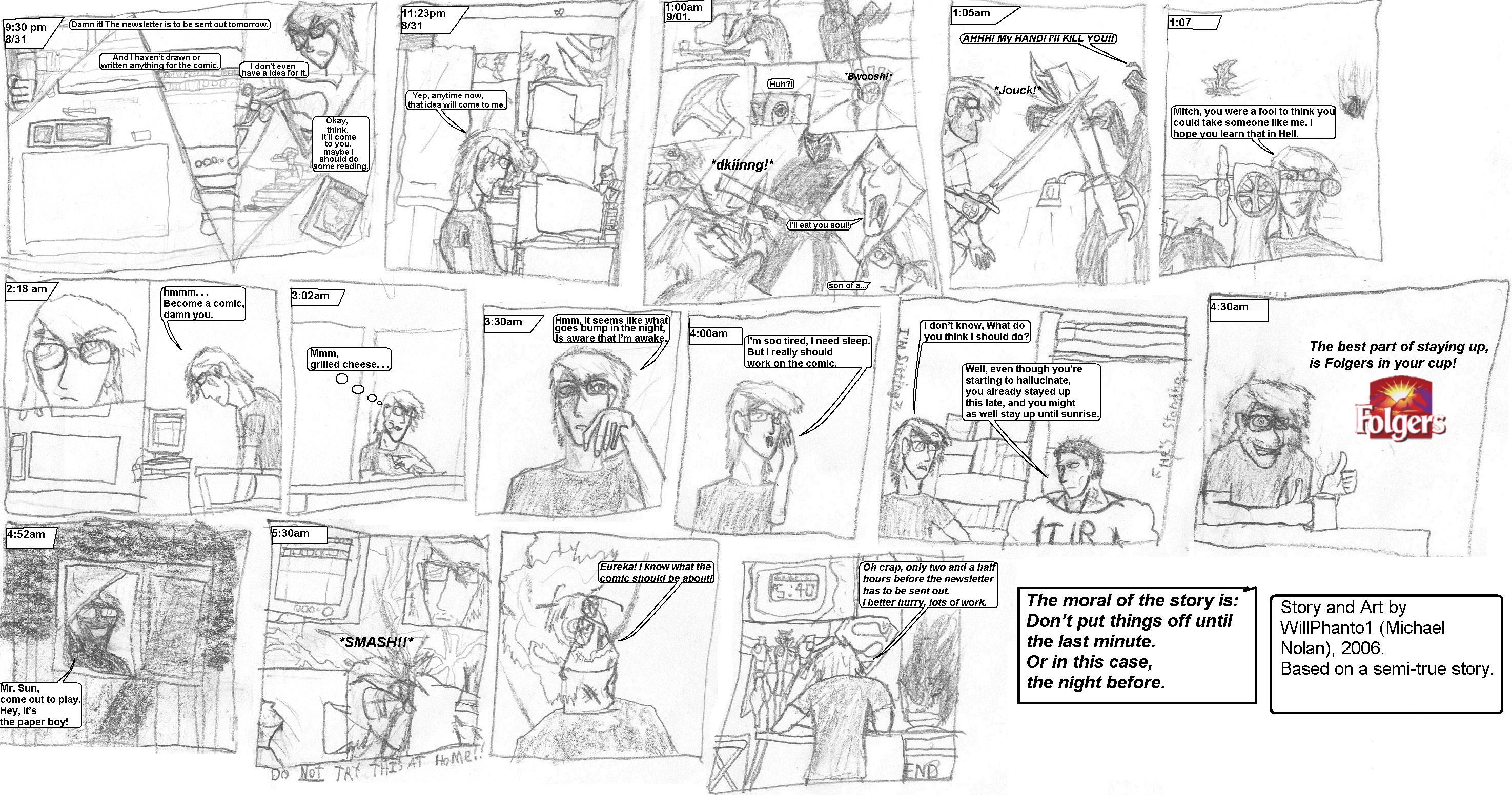 I had trouble thinking of a topic of the comic, until I re-read fillerbunny issue #1. The comic was drawn in one night by Jhonen Vasquez, which was incorporated into the comic. Inspired by this, I stayed up all night, drawing every hour whatever came to mind. It’s still one of mine personal favorites. At the time of writing this, I’m working a 3rd shift job. Maybe I’ll make a sequel about staying up all day.